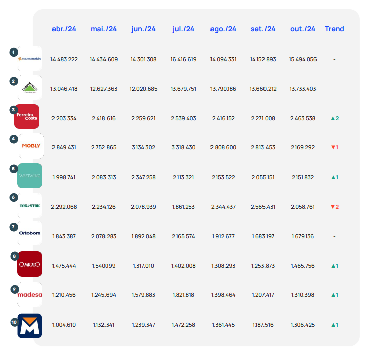 Agora, o que nenhuma outra empresa conseguiu fazer ainda é desbancar MadeiraMadeira e Leroy Merlin, que seguem nas duas primeiras colocações. A única diferença registrada em outubro é que a MadeiraMadeira retomou seu reinado como líder depois de ter sido ultrapassada pela Leroy Merlin em setembro.