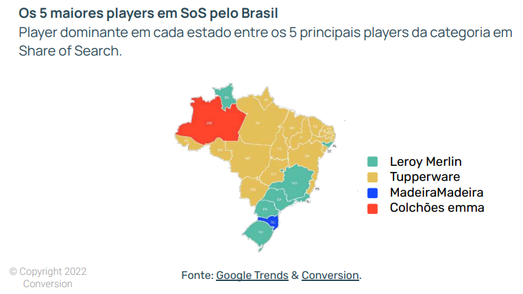 O Share of Search é uma métrica que se refere à participação nas buscas que uma marca possui dentro da sua categoria. E em Casa & Móveis os cinco maiores players são Leroy Merlin, Tupperware, MadeiraMadeira e Colchões Emma.