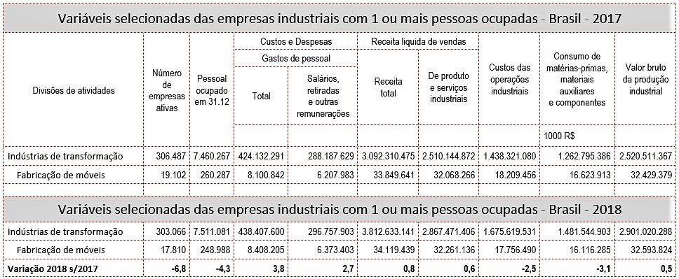 Pesquisa Indústria Anual do IBGE referente aos dados de 2018 acaba de ser publicada. E a primeira observação é que o número de empresas recuou 6,8% na comparação com 2017. Em dezembro de 2018 eram 17.810 empresas de móveis no Brasil, ocupando 249 mil pessoas, 4,3% menos do que no ano anterior. O salário médio chegou a R$ 2.333,00, alta de 2,7% em relação a 2017.
