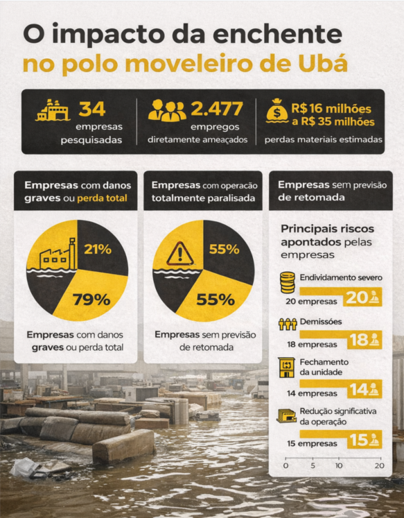 A enchente que atingiu Ubá (MG) no dia 24 de fevereiro de 2026 provocou um dos maiores impactos econômicos recentes no polo moveleiro da cidade, um dos mais importantes do Brasil. Levantamento emergencial realizado pelo Intersind – Sindicato Intermunicipal das Indústrias do Mobiliário de Ubá aponta prejuízos materiais que já ultrapassam R$ 16 milhões, podendo superar R$ 35 milhões conforme novos levantamentos sejam concluídos.
