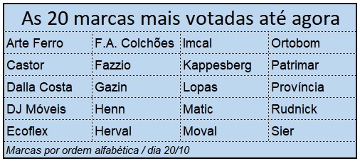 O prazo para votar nas indústrias de móveis com melhor performance em produtos, serviços, atendimento e assistência pós venda, e conceder a elas o privilégio de integrar o ranking das TOP 20, encerra dia 05 de novembro. Mas o engajamento das empresas que concorrem ao prêmio realizado pela revista Móveis de Valor, com apoio da Blu, tem provocado mudanças constantes nas marcas que estão entre as 20 mais votadas. Embora a revista divulgue o ranking das 20 por ordem alfabética, as empresas são informadas individualmente sobre o número de votos que sua marca recebeu e a colocação que alcançou.