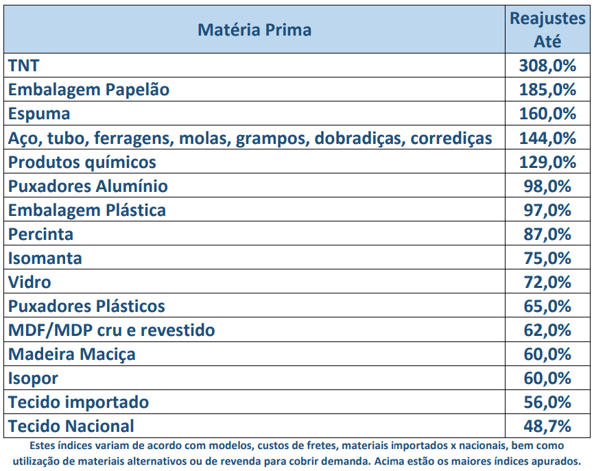 A nota acentua que as margens das indústrias estão sendo esmagadas entre aumentos de matéria-prima imediatos e repasses nos móveis tardiamente. E lista os principais itens que sofreram os maiores reajustes que estão sendo “absorvidos” pela indústria.