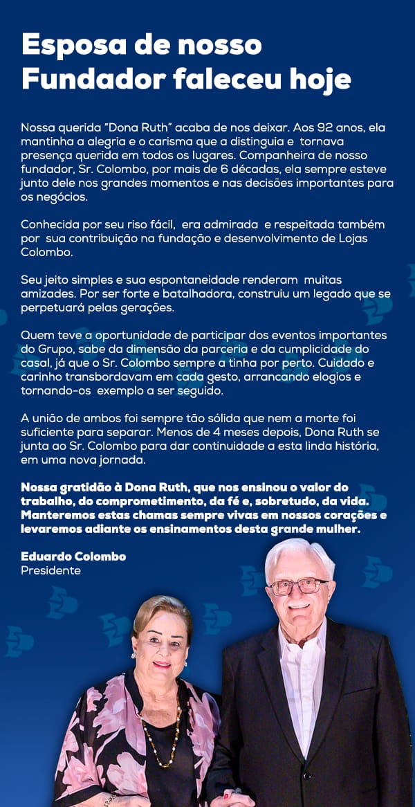 Veja abaixo Nota de Pesar assinada pelo neto de dona Ruth, Eduardo Colombo, presidente do grupo Colombo: