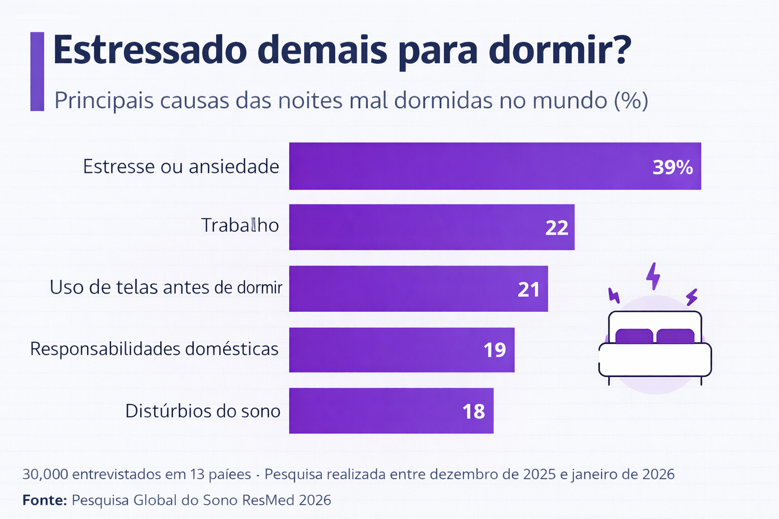 Entre os principais fatores apontados para a má qualidade do sono, o estresse e a ansiedade aparecem como a causa mais citada, mencionada por 39% dos participantes. Em seguida surgem o trabalho (22%) e o uso de telas antes de dormir (21%).