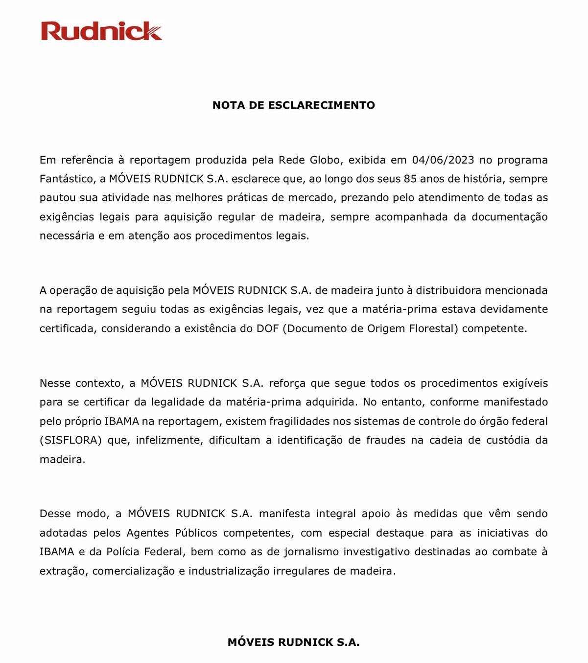 A Móveis Rudnick disse em nota que preza pelas exigências legais para aquisição regular de madeira e que apoia as ações do Ibama e da Polícia Federal (veja íntegra da nota abaixo).