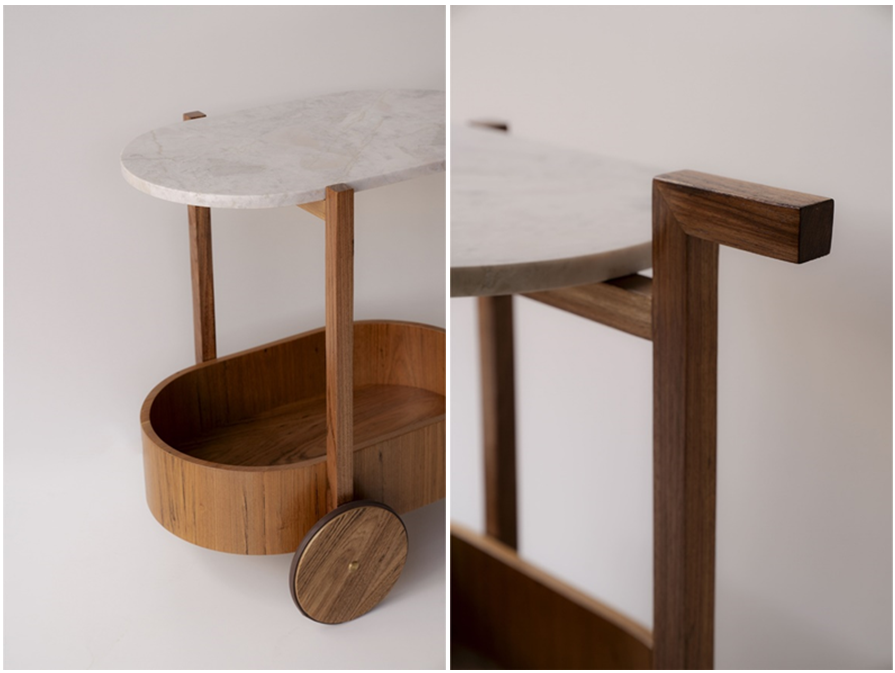 Com linhas retas e elementos curvos que introduzem movimento, o design é equilibrado e leve. A estrutura de três pés, feita em madeira maciça de freijó — espécie nativa brasileira reconhecida por sua durabilidade e tons quentes —, contrasta com o tampo personalizável: madeira, quartzito ou mármore brasileiros, garantindo robustez e elegância. Os detalhes em latão nas rodas complementam a peça.