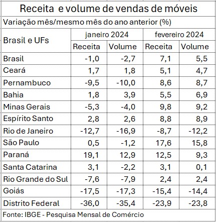 Veja abaixo o quadro do desempenho do comércio de móveis em janeiro e fevereiro deste ano: