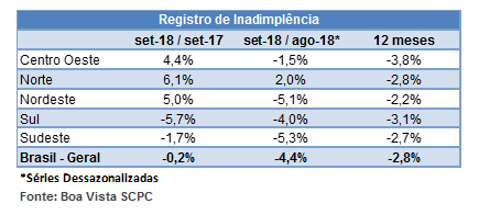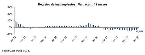 A inadimplência do consumidor caiu 2,8% no acumulado em 12 meses (outubro de 2017 até setembro de 2018 frente aos 12 meses antecedentes), de acordo com dados nacionais da Boa Vista SCPC. Na avaliação mensal com ajuste sazonal, setembro apresentou variação negativa de -4,4% frente a agosto. Quando comparado o resultado contra o mesmo mês de 2017, o indicador caiu 0,2%.