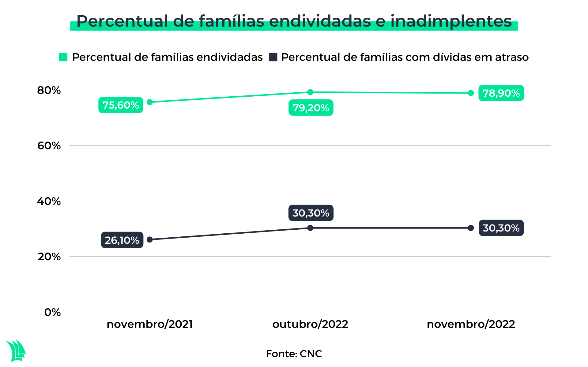 De acordo com dados da CNC (Confederação Nacional do Comércio) divulgados em 6 de dezembro, o percentual de famílias que relataram ter dívidas a vencer recuou 0,3 ponto percentual em novembro, na comparação com o mês anterior, alcançando 78,9% das famílias brasileiras.