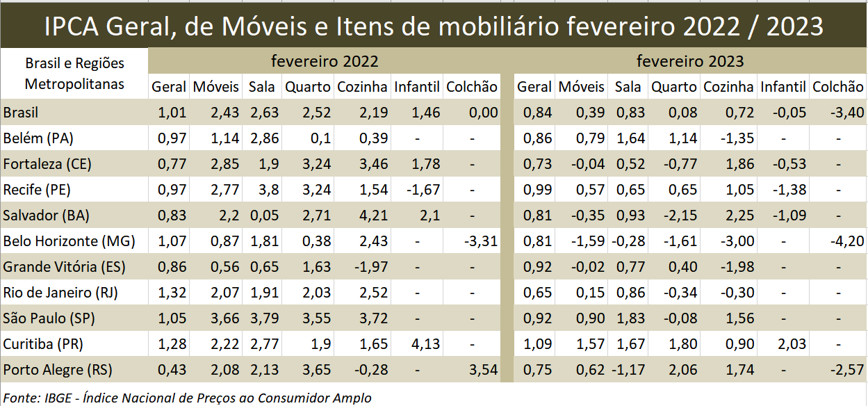 Depois de dois anos em que o Índice de Preços ao Consumidor Amplo (IPCA) de móveis vinha superando com folga o índice geral, em fevereiro deste ano, a inflação de móveis é menor que geral, 0,39% e 0,84% respectivamente.