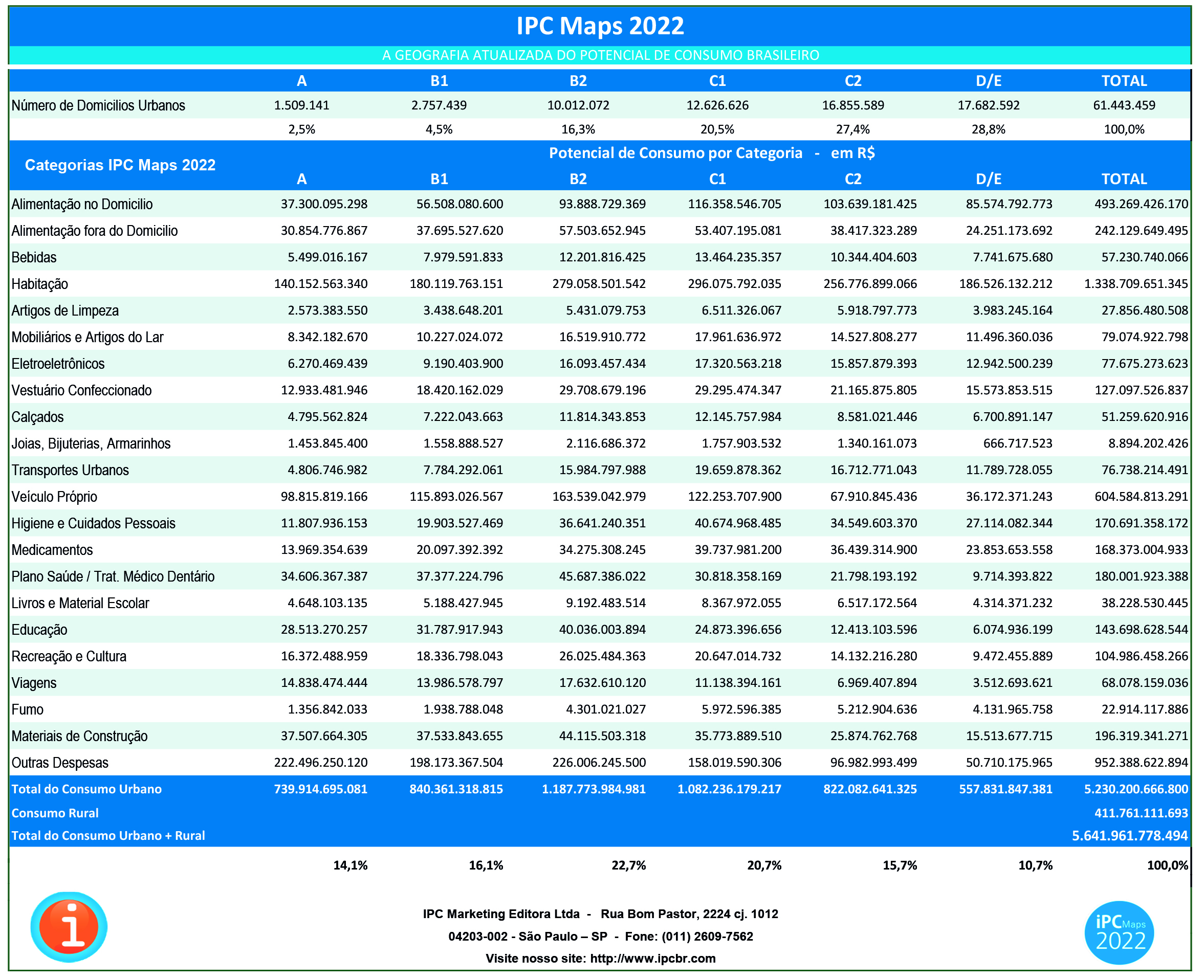 Base consumidora — Tradicionalmente, a classe B2 lidera o panorama econômico, representando cerca de R$ 1,2 trilhão dos gastos. Junto à B1, pertencem a 20,8% dos domicílios, assumindo 38,8% (mais de R$ 2 trilhões) de tudo que será desembolsado pelas famílias brasileiras. Presentes em quase metade das residências (47,9%), C1 e C2 totalizam R$ 1,9 trilhão (36,4%) dos recursos gastos. Já o grupo D/E, que ocupa 28,8% das moradias, consome cerca de R$ 557,8 bilhões (10,7%). Embora em menor quantidade (apenas 2,5% das famílias), a classe A vem, cada vez mais, se distanciando socialmente dos menos favorecidos e ampliando sua movimentação para aproximadamente R$ 740 bilhões (14,1%).