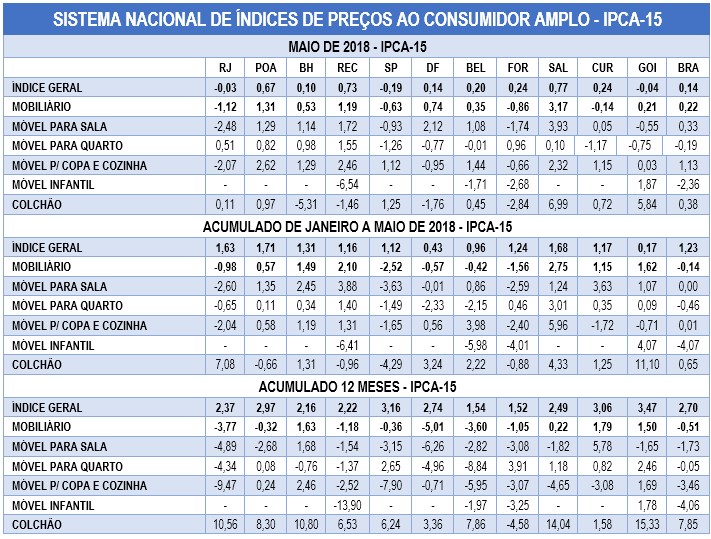 Finalmente, no acumulado de 12 meses, o IPCA-15 de móveis registra queda de 0,51% ante um IPCA-15 geral de 2,70%. A maior queda foi verificada no Distrito Federal, com -5,01% e a maior alta em Curitiba (PR), com 1,79%.