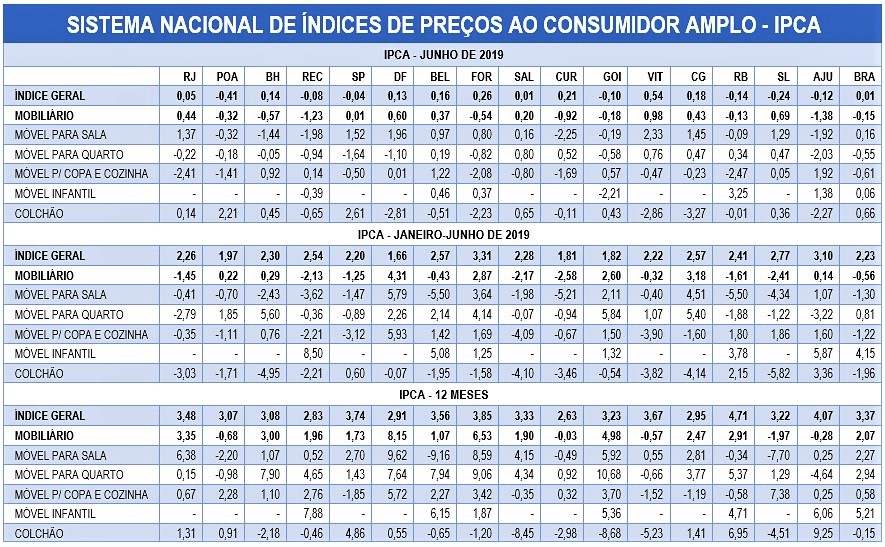 Por segmento, dos cinco pesquisados (móveis de quarto, sala, cozinha, infantil e colchão), a maior queda foi de móveis para copa e cozinha com -0,61% e a maior alta ficou com o segmento de colchão, 0,66%.