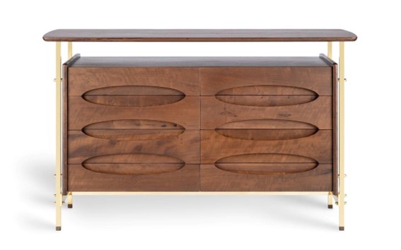 As pernas percorrem toda a altura da peça, ultrapassando o corpo — recurso recorrente no trabalho do designer. O destaque fica para a moldura delicadamente boleada nos puxadores cava e para os detalhes metálicos pontuais.