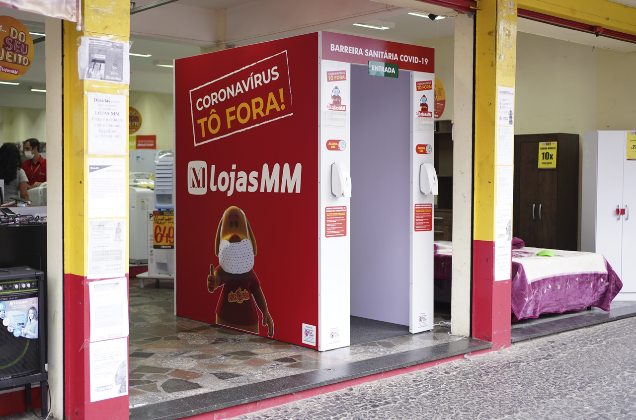 Com o intuito de ajudar a população a se proteger do coronavírus e ao mesmo tempo garantir que a economia continue girando, a Lojas MM instalou, na segunda-feira (27), uma barreira sanitária de desinfecção em sua loja do calçadão de Ponta Grossa (PR). Colocada na porta da loja, a barreira funciona como um higienizador para que o cliente possa entrar no estabelecimento depois de desinfectar suas mãos, o solado de seus calçados e seus pertences.
