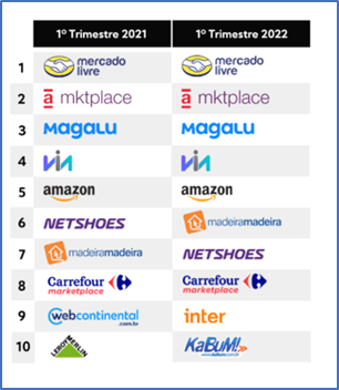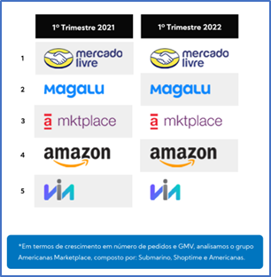 A Shopee conseguiu avançar duas posições no ranking e agora ocupa a quinta colocação. A empresa fez um grande investimento em publicidade para atrair consumidores e lojistas para a plataforma.