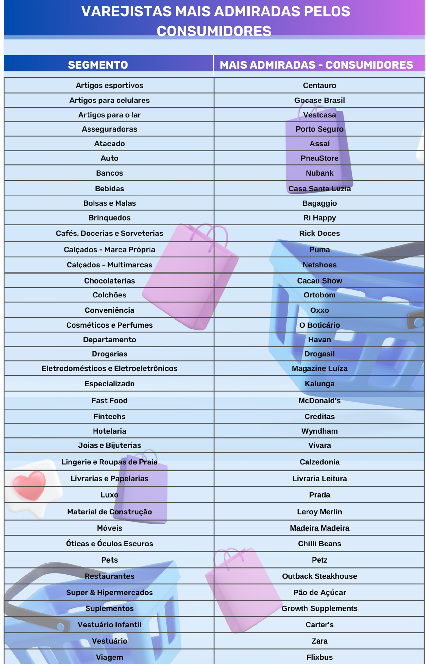 Neste ano, o ranking foi ampliado e passou a considerar operações de serviços: asseguradoras, bancos, cafés, fintechs, hotelarias, restaurantes e viagens, e bens de consumo: suplementos e luxo.