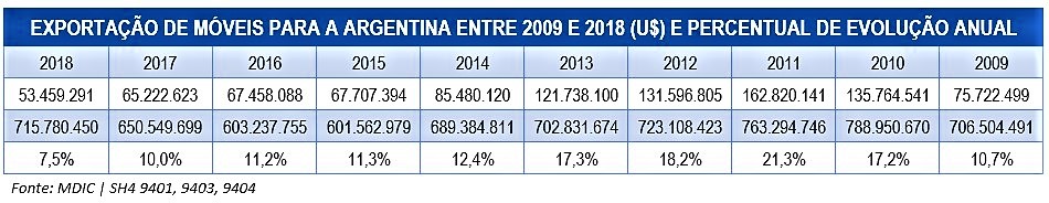 A possível derrota do atual presidente, Maurício Macri, não terá muita importância para as exportações brasileiras de móveis à Argentina. Isso porque, como se vê no quadro que preparamos, depois de evoluir a partir de 2009 até chegar ao máximo em 2011, quando representaram 21,3% do total das exportações, as vendas para o país vizinho só recuaram até atingir 7,5% de representatividade ano passado. E este ano, até junho, representa apenas 4,5%.