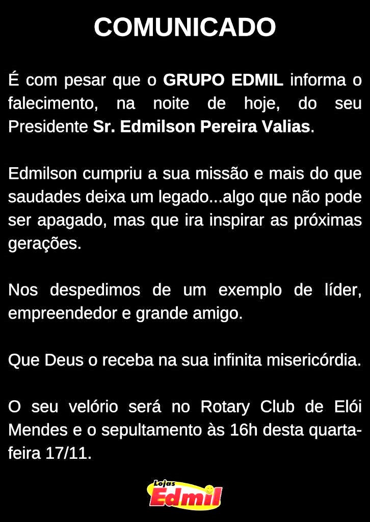 Segundo comunicado emitido pelo Grupo, detentor da rede de lojas Edmil, com atuação em diversas cidades de Minas Gerais, o empresário “cumpriu sua missão e mais do que saudades, deixa um legado que irá inspirar as próximas gerações”.