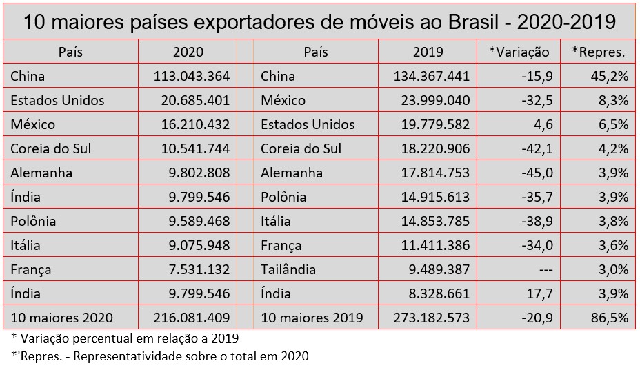 Mas, para piorar, as importações da China recuaram apenas 15,9%, bem menos que a média e representam mais de 45% do total de móveis comprados neste semestre. As maiores quedas vieram de países que exportam ao Brasil móveis de linhas mais altas como a Alemanha (-45%), Itália (-39%) e França (34%). Ao todo, o Brasil comprou móveis de 64 países até junho. Mas os 10 maiores enviam ao Brasil mais de 86% do total (veja quadro).