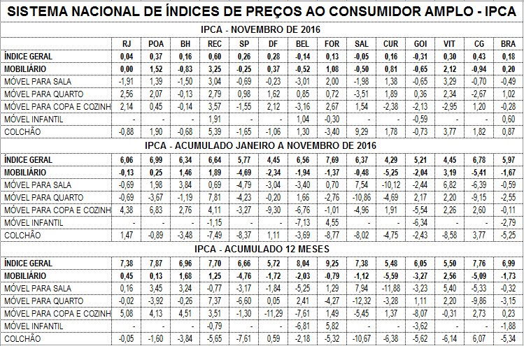 O item mobiliário continua apresentando deflação no acumulado do ano e dos últimos 12 meses, mas em novembro registrou alta acima da média do IPCA, com 0,20%. De janeiro a novembro ante um IPCA geral de 5,97% o item mobiliário registra queda de 1,67% e no acumulado de 12 meses, enquanto o IPCA geral é de 6,99%, mobiliário registra deflação de -1,73%.