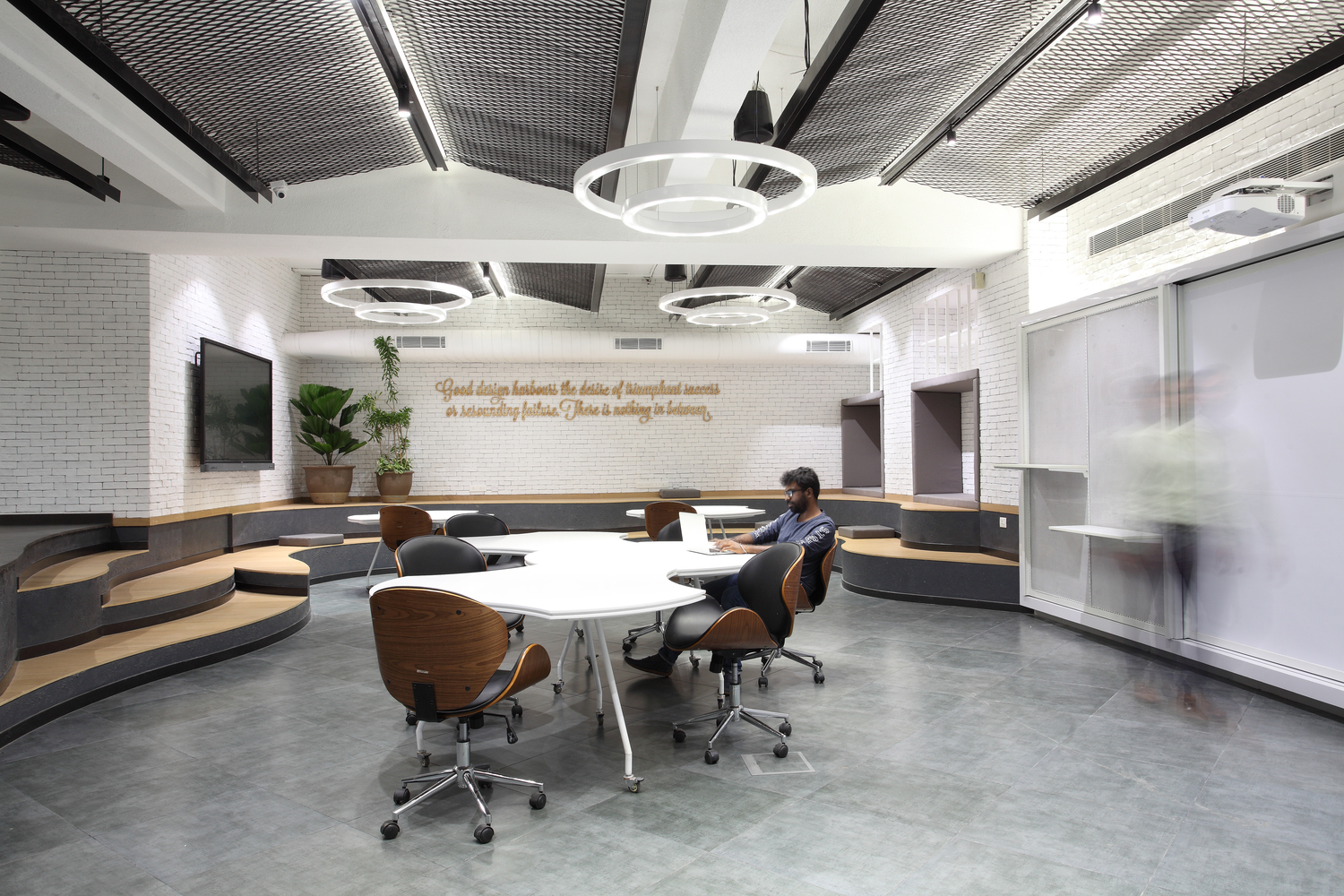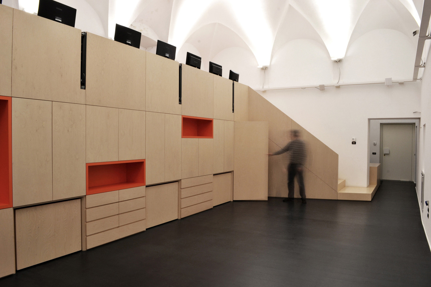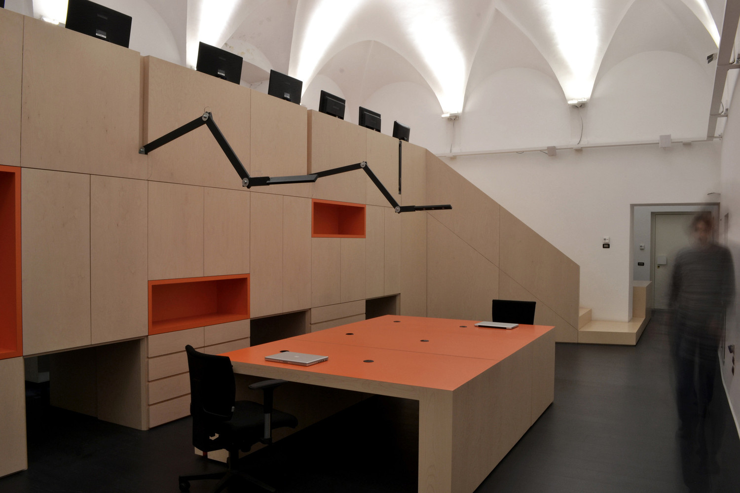 Outro exemplo corporativo, este escritório em Pisa, Itália, está centralizado em uma única grande unidade de móveis contendo um arquivo, um pequeno laboratório, paredes e prateleiras. Dentro desta unidade, três grandes mesas sobre rodas podem ser removidas para adicionar espaços de trabalho adicionais no piso inferior, quando necessário. Esta estratégia de design permite que o nível inferior seja mantido aberto e acessível na maioria das vezes, mas também permite que ele seja facilmente modificado quando espaço extra é necessário.
