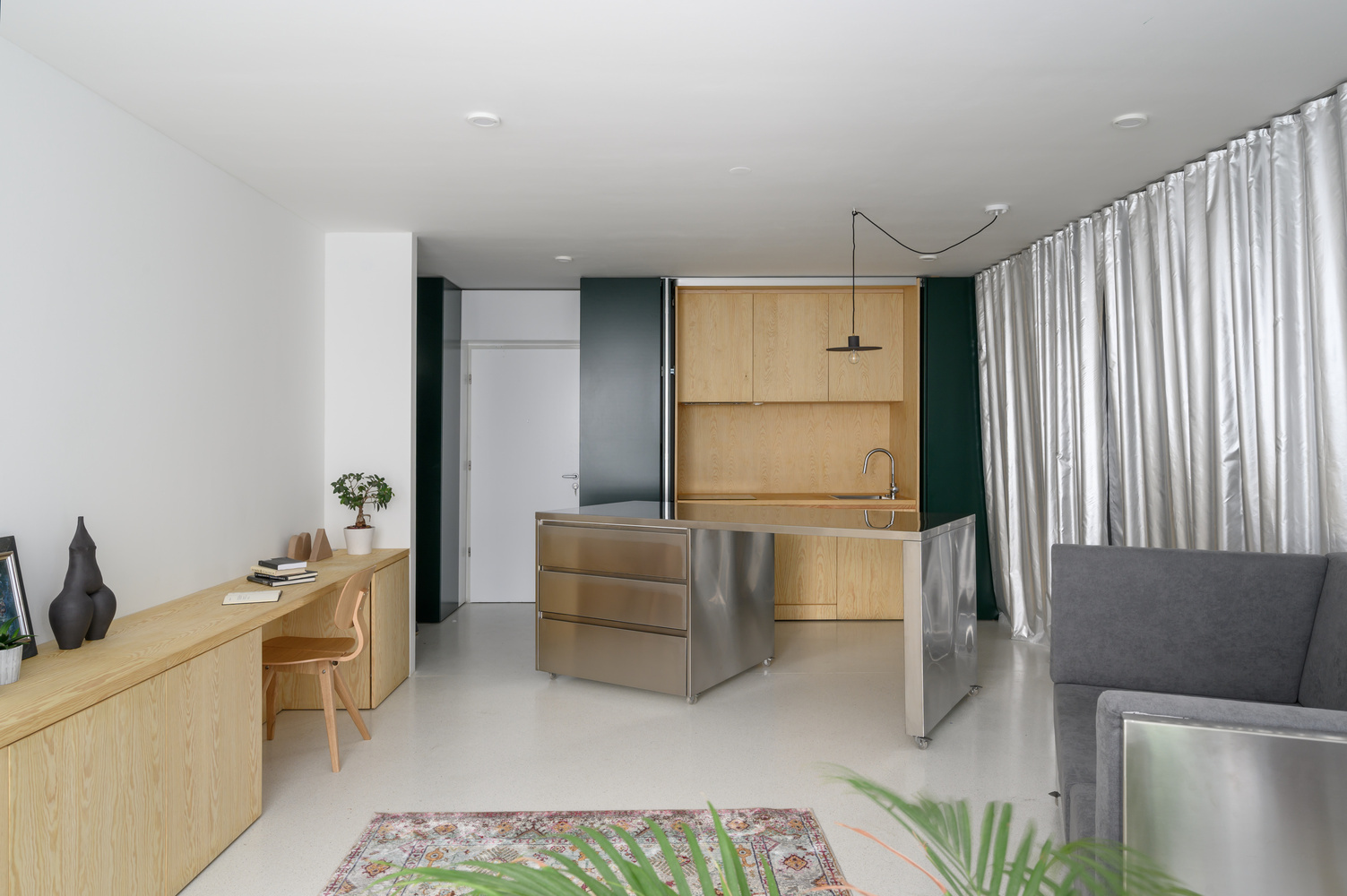 Este apartamento utiliza um único objeto de mobília sobre rodas, em vez de um conjunto reconfigurável de módulos. Este balcão de bar sobre rodas personalizado foi concebido para se deslocar facilmente ao longo da cozinha, funcionando como uma mesa de trabalho adicional ou mesa de serviço que pode acompanhar o utilizador ao longo do balcão ou ao redor da cozinha. Este elemento manobrável é extremamente útil para qualquer pessoa que esteja cozinhando ou trabalhando na área.