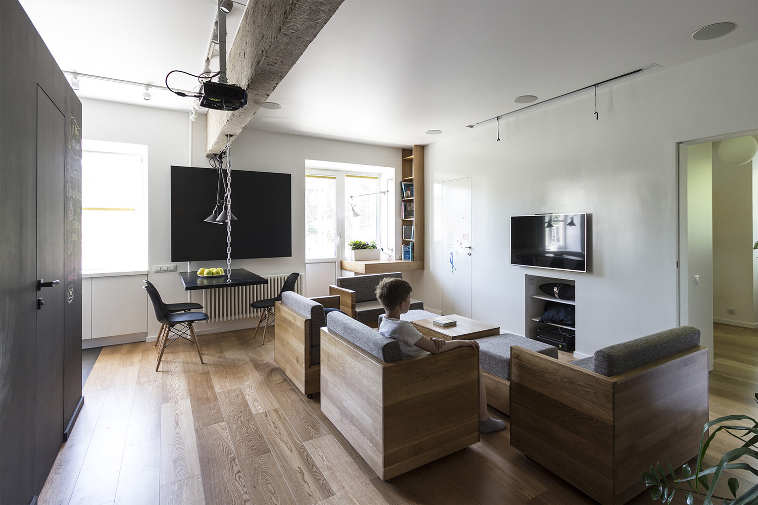 Esta reforma de apartamento utiliza móveis sobre rodas em sete módulos: quatro poltronas, dois pufes e uma mesa de centro. Estas peças foram pensadas para ir de encontro às necessidades de uma família com dois filhos, permitindo que a sala de estar seja remontada de acordo com os vários eventos sociais e familiares: ver filmes em família, jogos de tabuleiro, receber convidados, etc. Essa dimensão divertida e flexível do design do apartamento acompanha uma série de outros itens de mobiliário projetados para facilitar o jogo, incluindo um conjunto de escalada, rede, mini-casas e lousas de desenho.