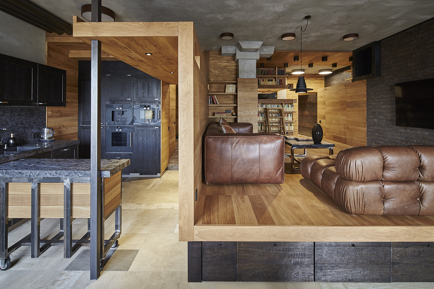 Este apartamento para três em Ljubljana, na Eslovênia, contém um balcão amplo e um grande sofá sobre rodas de metal industriais. Estas duas peças de mobiliário, foco central da sala, permitem aos proprietários reorganizar rapidamente o espaço de acordo com a sua variedade de necessidades e área limitada. Segundo os arquitetos, seus clientes planejavam praticar ioga, treinar seu cachorro e organizar eventos sociais, noites de cinema e jantares, tudo nesse espaço único. Para eles, portanto, a flexibilidade era uma necessidade melhor alcançada por móveis sobre rodas.