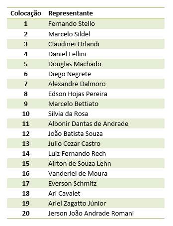 Participaram da promoção os representantes comerciais ligados aos expositores da Movelsul Brasil 2018. Os 20 primeiros colocados na soma de votos (pontos) de lojistas na Movelsul Brasil 2018 ganharam uma viagem para Bento Gonçalves. Os venvesores podem levar um acompanhante para desfrutar duas diárias em um hotel da rede Dall’Onder e um passeio turístico. Confira a lista dos vencedores a seguir:
