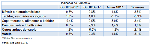 O Indicador Movimento do Comércio, que acompanha o desempenho das vendas no varejo em todo o Brasil, subiu 0,3% em outubro na avaliação mensal dessazonalizada, de acordo com os dados apurados pela Boa Vista SCPC. No acumulado em 12 meses (novembro de 2017 até outubro de 2018 frente ao mesmo período do ano anterior), o indicador avançou 3,1%. Já na avaliação contra outubro do ano passado o varejo cresceu 0,3%.