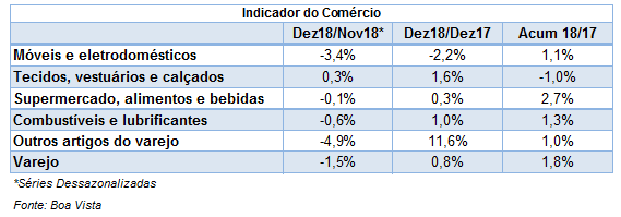 O Indicador Movimento do Comércio, que acompanha o desempenho das vendas no varejo em todo o Brasil, subiu 1,8% em 2018, de acordo com dados apurados pela Boa Vista. Na avaliação mensal dessazonalizada, o indicador caiu 1,5% em dezembro. Já na avaliação contra dezembro do ano anterior o varejo cresceu 0,8%.