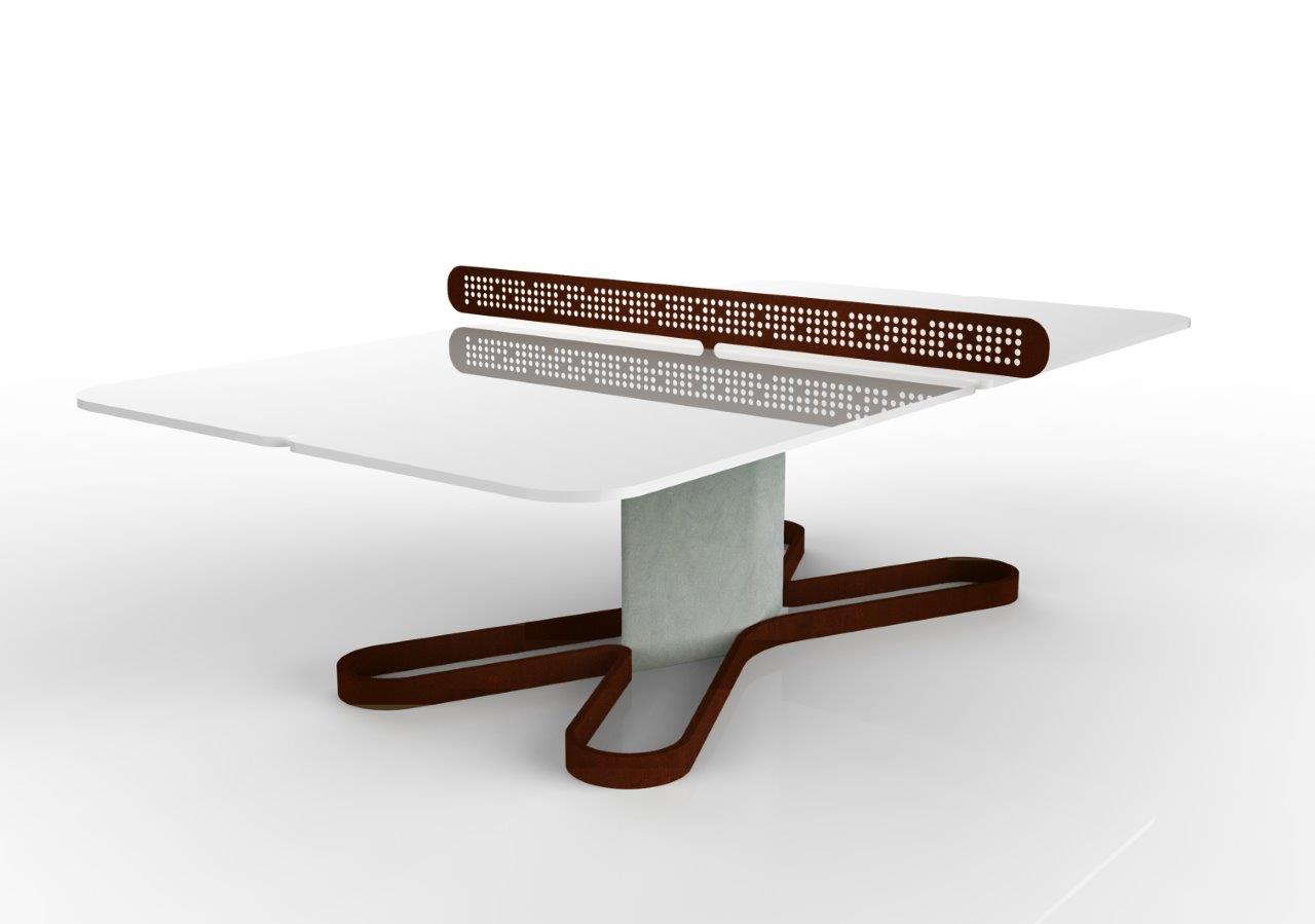 O famoso tênis de mesa, ou ping-pong, ganhou uma releitura clean e moderna. O ‘X’ da base, feito em aço corten, foi integrado ao nome. A coluna central é estruturada em concreto, e a rede é removível, transformando a peça em uma mesa de jantar.