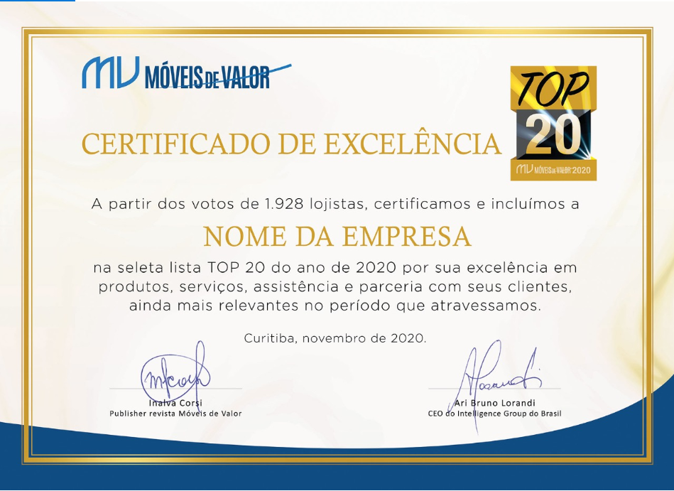 As vencedoras do TOP 20 de 2020 receberam da revista Móveis de Valor o Certificado de Excelência e passam a ter direito de usar em sua comunicação o Selo TOP 20, válido por um ano.