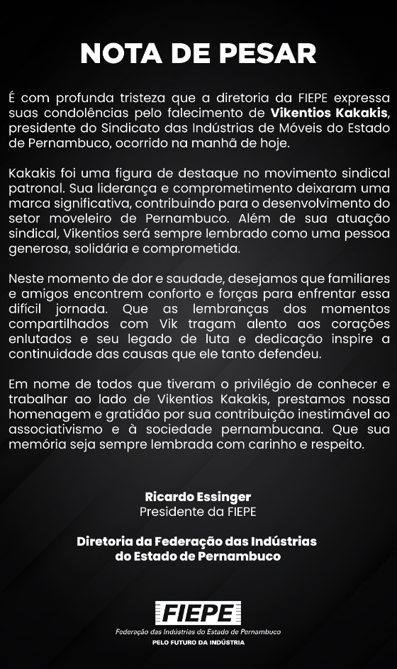 O presidente da Federação das Indústrias do Estado de Pernambuco, Ricardo Essinger, emitiu Nota de Pesar destacando que “Kakakis foi uma figura de destaque no movimento sindical patronal. Sua liderança e comprometimento deixaram uma marca significativa, contribuindo para o desenvolvimento do setor moveleiro de Pernambuco. Além de sua atuação sindical, Vikentios será sempre lembrado como uma pessoa generosa, solidária e comprometida”.