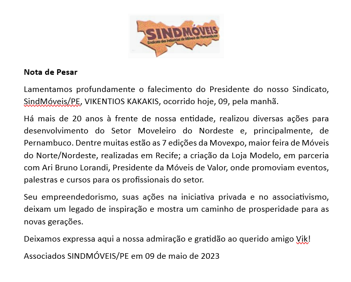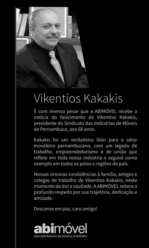 A Abimóvel também lamentou o falecimento de Vikentios e ressaltou seu papel como líder do setor moveleiro pernambucano. “Kakakis foi um verdadeiro líder para o setor moveleiro pernambucano, com um legado de trabalho, empreendedorismo e de união que reflete em toda nossa indústria e seguirá como exemplo em todos os polos e regiões do país”.