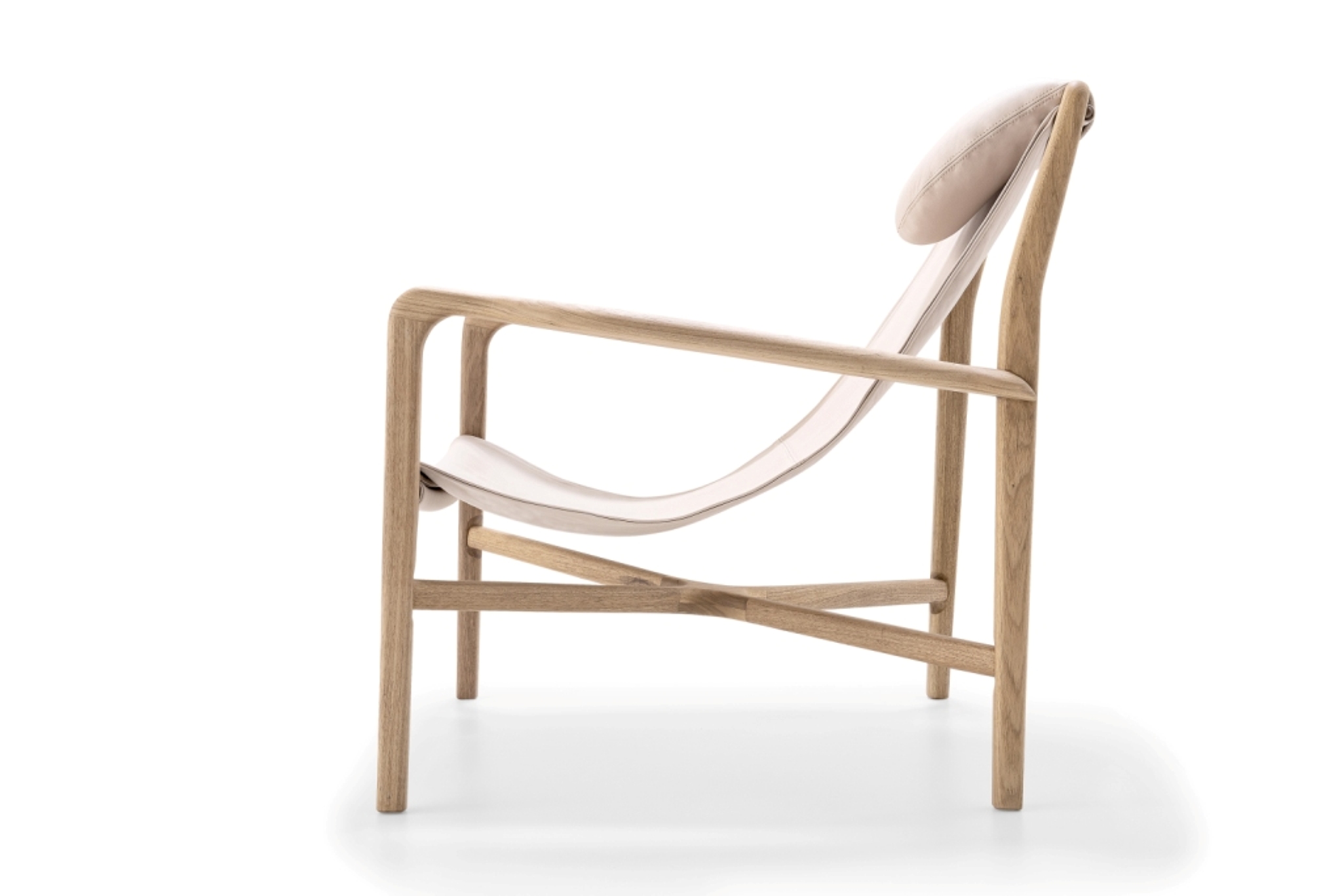 Poltrona Caymmi - Inspirada no estilo moderno dos anos 50, a peça tem balanço de couro apoiado em duas pontas, um desenho característico de época que ganhou um redesenho orgânico na estrutura, ganhando toque contemporâneo.