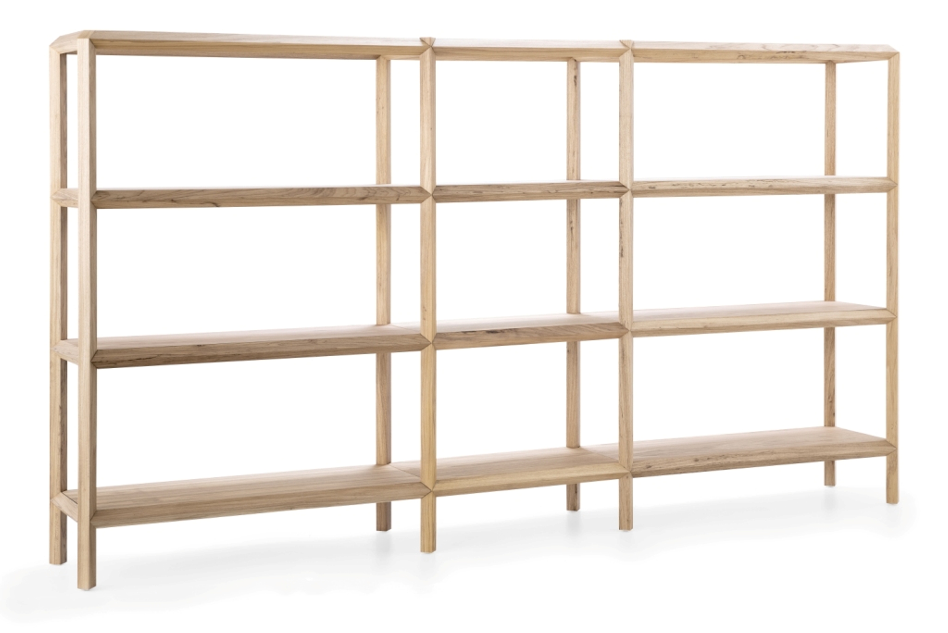Mesa e Estante Edge - caracterizadas por suas estruturas lineares, todos os elementos e bordas das peças, disponíveis em duas dimensões, criam um efeito visual de luz e sombra. Inspiradas no mundo metafísico das pinturas de Giorgio De Chirico, retratam a vista em perspectiva da colunata na Piazza d'Italia gerando a oportunidade de criar um elemento construtivo que pode caracterizar toda a coleção: a placa de madeira de seção quadrada, posicionada em um ângulo. A borda frontal define claramente a silhueta dos produtos e destaca a materialidade da madeira investida pela luz de um lado e a sombra do outro por diferentes ângulos. Uma visão tridimensional do produto que, como no caso da estante de livros, enquadra os objetos colocados nele.