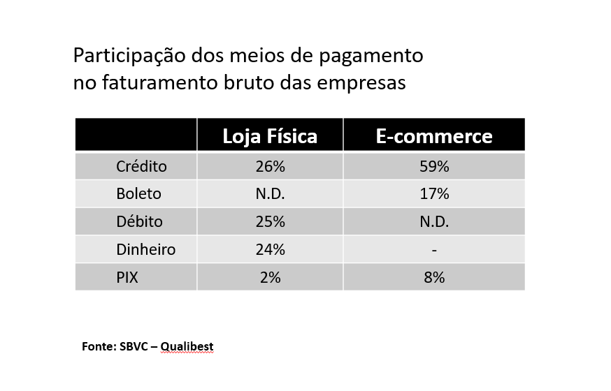 Nas lojas físicas, cartão de crédito (58%), débito (57%) e dinheiro (68%) são as formas mais empregadas. As empresas entrevistadas permitem pagamento por esses meios. A forma de pagamento depende do tipo de compra e do produto adquirido. Normalmente, bens duráveis são pagos com cartão de crédito, muitas vezes parcelado. Já nas compras de consumo imediato, o mais comum é o uso de cartão de débito.