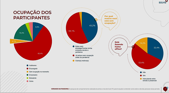 Agora, quando se trata da ocupação dos participantes, os dados chamam mais a atenção, já que a maioria é de empregados (63,4%) e que estão fazendo home office (53,4%), porém um fato relevante é que grande parcela dos desempregados é composta por empresários que tiveram de fechar suas empresas durante a pandemia e trabalhadores que foram demitidos nesse mesmo período, o que corresponde a 43,2%.