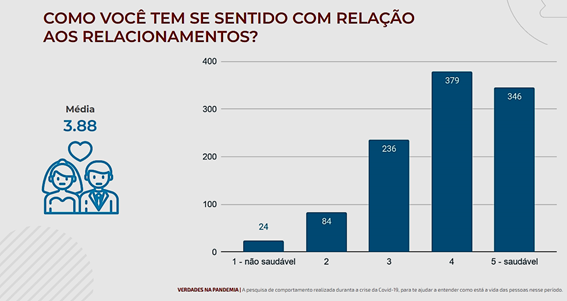 A primeira coisa que a Solvis perguntou foi sobre como as pessoas estão se sentindo em relação aos relacionamentos pessoais desde o início da pandemia e, no geral, os entrevistados afirmaram que as relações estão saudáveis, como você pode observar no gráfico abaixo: