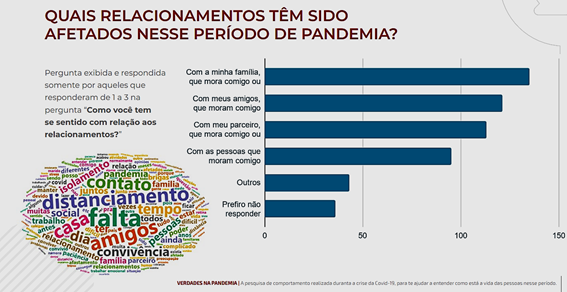 Para aqueles que responderam que os relacionamentos não estão tão saudáveis (correspondente as colunas 1, 2 e 3) foi feita mais uma pergunta: “quais relacionamentos têm sido afetados nesse período de pandemia?”. E, como alguns já esperavam, por conta do maior tempo passado em casa, as dificuldades em se relacionar com a família ou quem mora na mesma casa aparecem em primeiro lugar: