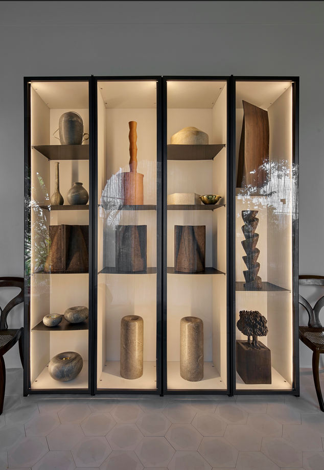 O uso de materiais naturais está cada vez mais em alta. Madeira, pedras, couro, tecidos naturais e outros elementos encontrados na natureza são protagonistas em diversos ambientes da mostra. Uma das novidades desta edição é a linha assinada por Pedro Lázaro para Leform, especializada em planejados de alto padrão. As peças podem ser conferidas na Sala da Lareira e Varanda, e já podem ser adquiridas diretamente com a empresa. Reunindo madeira, vidro, couro e metal, as peças inovam ao utilizar o couro como revestimento interno dos armários, com prateleiras metálicas. Outro destaque do ambiente é a exclusiva cortina em seda rústica amassada, com tecido de origem indiana fornecido pela Marie Camille, outra novidade que chega agora ao mercado.