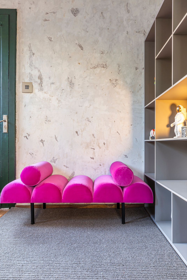 No ambiente Hera uma Vez, assinado por Laura Carvalho algumas peças criadas pela arquiteta complementam com precisão o espaço que evoca uma atmosfera de fantasia e memórias. O recamier, em veludo de algodão, foi viabilizado por meio de uma parceria com a Amém Casa. Já as mesas em pedra natural (mármore, quartzo e granito), em diferentes cores e alturas, brincam com a espacialidade, agregando requinte e uma boa dose de ousadia. As mesas foram executadas em parceria com a Del Rei Pedras e estão fazendo tanto sucesso que também farão parte da linha de produtos da empresa.
