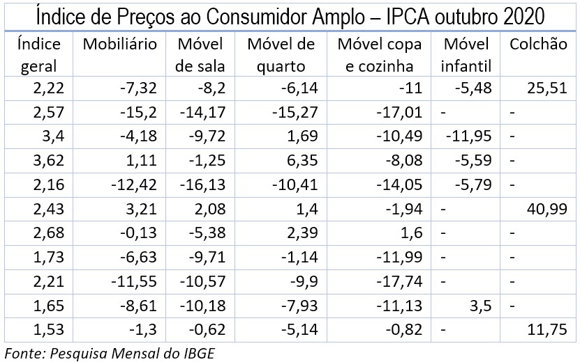 Apesar da expressiva alta dos colchões, o preço dos móveis no varejo até outubro ainda apresenta deflação (-7,3%). Das 10 regiões pesquisadas pelo IBGE, em apenas duas mobiliário registra alta: No Recife 1,11% e em Belo Horizonte, com 2,08%.