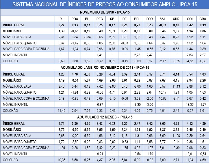 Mobiliário, contrariando sua trajetória dos últimos anos, registrou alta de 0,86% em novembro, segundo apurou o IPCA-15, medido pelo IBGE. Este é o maior percentual para o mês de novembro desde 2009, quando o IPCA-15 de mobiliário alcançou 1,10%. E, importante destacar também que o índice de novembro atingiu 1,81% em São Paulo, o maior mercado brasileiro do setor.