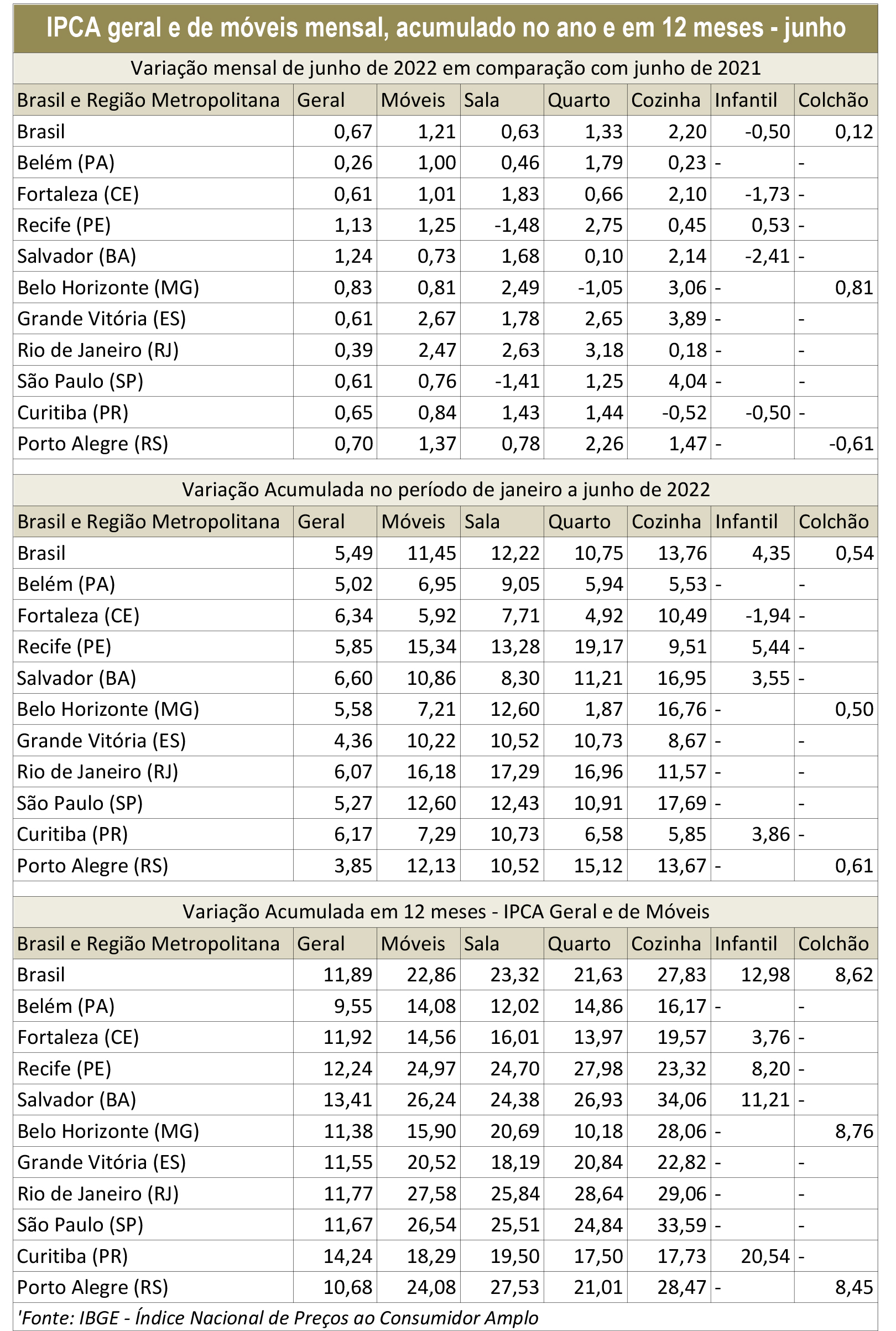 Jamais na recente história moveleira, a evolução dos preços de móveis avançou tanto em comparação com o IPCA geral. Analisando o histórico do Índice de Preços ao Consumidor Amplo desde 1999 até junho de 2022, o índice geral subiu 24,4 pontos percentuais a mais que o índice de mobiliário. Porém, nos últimos anos, impulsionado pelos preços pós-pandemia, mobiliário disparou 42,2% ante o IPCA geral no período de 2021 e 2022 até junho de 16,1% (Veja nos quadros abaixo).