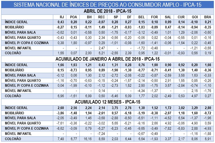O Índice Nacional de Preços ao Consumidor Amplo-15 (IPCA-15), prévia da inflação oficial referente ao mês de abril do IBGE, registrou nova queda no preço dos móveis no varejo. O item mobiliário apresentou queda de -0,35% em abril, anulando a alta de 0,33% ocorrida em março.
