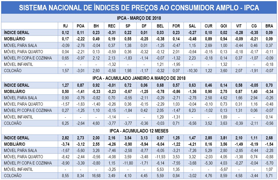 Também chama atenção o leve recuo (0,07%) no segmento de colchões, tradicionalmente um item que vinha apresentando elevadas taxas até o final de 2017. Tanto que, no período de 12 meses terminados em março, a alta do preço dos colchões no varejo alcançou 5,71%, ante um IPCA geral de 2,68% e um IPCA de mobiliário com -1,54%.