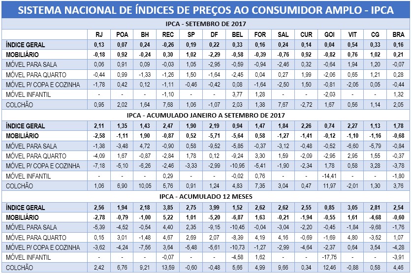 O IPCA de mobiliário registrou em setembro a segunda alta consecutiva. Depois do reajuste de 0,32% em agosto, subiu 0,21% em setembro, mais que a média geral do IPCA que ficou em 0,16%. Novamente o segmento de colchão foi o que apresentou a maior alta com 2,05%, enquanto móveis de copa e cozinha registraram a maior queda com -0,44%. Por região, o maior pico de alta aconteceu em São Paulo e Campo Grande com 1,02%. A queda maior foi verificada no Distrito Federal com -2,29%.